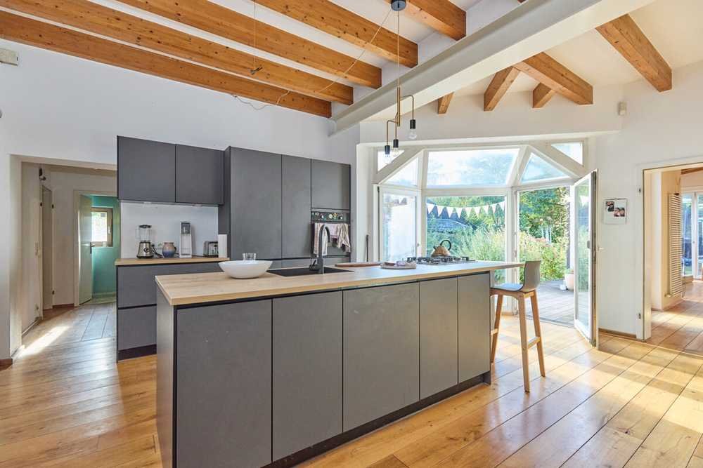 Von einem offenen und modern gestalteten Küchen- und Essbereich mit freistehendem Küchenblock gelangt man auf die Terrasse und in den Garten des Hauses. Bodentiefe Fenster, die den Zugang zur Terrasse ermöglichen, durchfluten die Räumlichkeiten mit viel Licht. Das helle Wohnzimmer, das ebenfalls über zusätzliche Zugänge zur Terrasse verfügt. Das Wohnzimmer beeindruckt mit seiner Weite, den bodentiefen Fenstern, hohen Decken und dem freien Blick in den Garten. So entsteht eine angenehme Verbindung zwischen Innen- und Außenbereich.