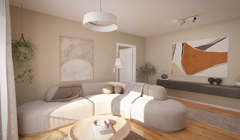 Die helle Fassade und die großen Fenster schenken jedem Raum ein angenehmes, natürliches Licht – vom ersten Sonnenstrahl am Morgen bis zum goldenen Abendlicht. Der offen gestaltete Wohn-, Ess- und Kochbereich wird zum Herzen der Wohnung – hier wird gekocht, gelacht, gelebt.