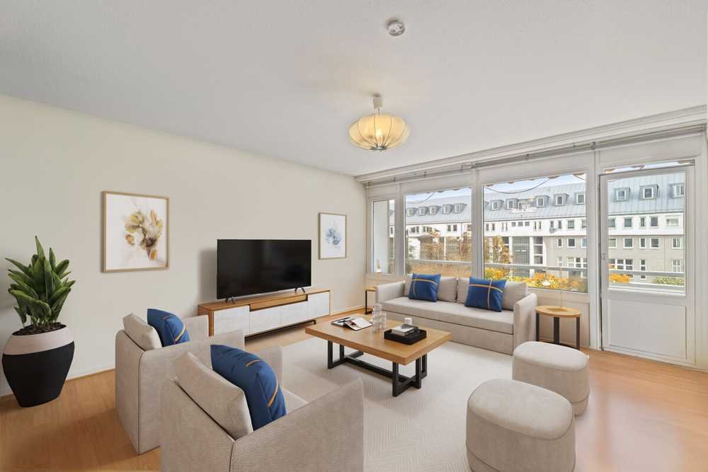Auf rund 85 m² Wohnfläche überzeugt die Wohnung mit einem durchdachten Grundriss und dreieinhalb Zimmern – ideal für Paare, kleine Familien oder das Wohnen mit Homeoffice. Zwei Schlafzimmer, ein Badezimmer und ein Gäste-WC bieten Platz für individuelle Wohnideen. Der offene Flur mit Essbereich wirkt einladend, das helle Wohnzimmer mit Zugang zur Loggia bietet einen schönen Blick über das Stadtgeschehen. Auch die abgeschlossene Küche führt auf die Loggia – perfekt für den ersten Kaffee am Morgen oder den Feierabend.