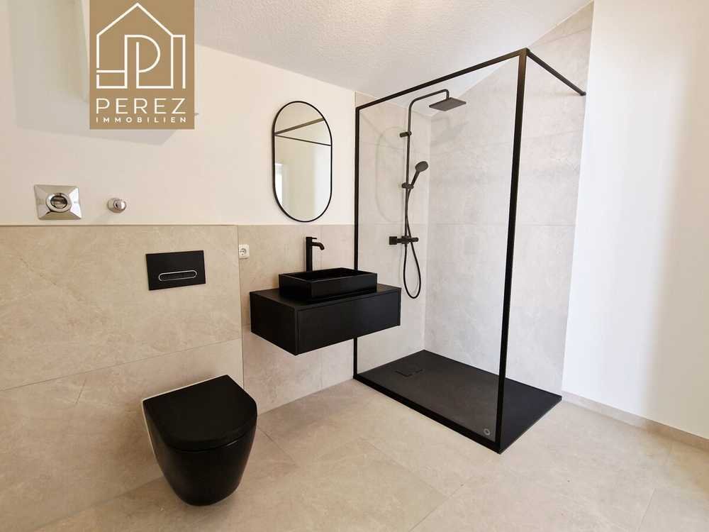 Das moderne Badezimmer ist ein wahres Highlight der Wohnung, ausgestattet mit einer begehbaren Dusche, Hänge WC und einem Aufsatzwaschbecken samt Waschtisch in schwarz, spiegelt es die aktuellen Badtrends wieder.