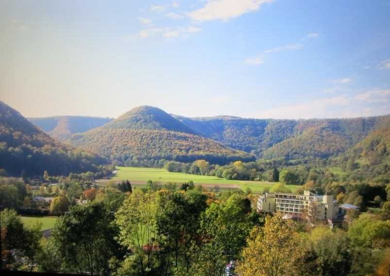 Es befindet sich in sonniger Lage mit einem unbezahlbaren, wunderschönen Panoramablick zur Burgruine Hohenurach und zum Thermalbad und Kurpark.