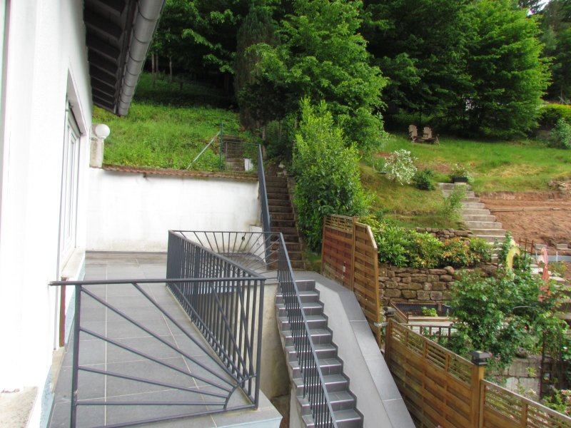 Das Haus empfängt Sie über mehrere Terrassenebenen, die sich harmonisch in das Hanggrundstück einfügen. Das Garagendach dient als großzügige Terrasse, ideal zum Entspannen oder für gesellige Grillabende. Über den ersten Treppenaufgang erreichen Sie die Kellerräume mit Heiz- und Hauswirtschaftsraum sowie einem Hobbyraum. Die nächste Ebene führt zum Haupteingang des Wohnhauses und einer weiteren Terrasse. Von hier gelangen Sie über eine massive Holztreppe in das Obergeschoss sowie auf die dritte Terrassenebene und von dort geht es weiter in den stufenartig angelegten Garten.