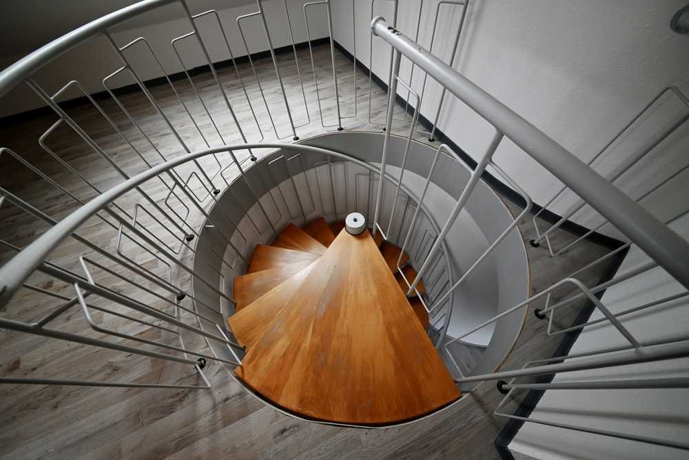 Über eien Wendeltreppe geht es zur zweiten Ebene. Hier befindet sich eine Galerie, von der ein Arbeitszimmer abgetrennt wurde.