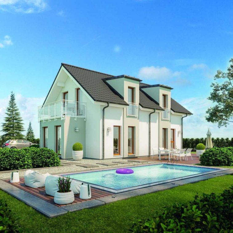 Dieses Fertighaus bietet alles, was sich eine junge Familie mit zwei Kindern nur wünschen kann: Von außen punktet es mit seiner frischen, jugendlichen Ausstrahlung, im Innern sind es die vielen praktischen Details, die überzeugen. Dank der kompakten Außenmaße von 7,45 x 10,04 m findet der rechteckige Baukörper selbst auf kleineren Grundstücken bequem Platz. Wie alle Entwürfe von Bien-Zenker lässt sich auch das EDITION 120 mit additiven Architektur-Bauteilen erweitern. In diesem Planungsbeispiel schafft ein großzügig verglaster Rechteck-Erker mit sonnigem Balkon im Innen- wie im Außenbereich gemütliche Treffpunkte. Hinzu kommen zwei symmetrisch platzierte Zwerchgiebel mit Pultdach und Fassadenaufdopplung, die im Dachgeschoss für Bewegungsfreiheit sorgen. Sanft heben sich die Architektur-Bauteile mit ihrem hellen Grau von der strahlend weißen Mineralputzfassade ab. Einen schönen Kontrapunkt setzen die warmen Holzfensterrahmen. Zusammen mit den weiten Dachüberständen verleihen sie dem Gebäude einen modernen Landhauslook. Der Eingang befindet sich auf der Giebelseite. Je nach Grundstückssituation kann er aber auch auf die Traufseite gelegt werden. Hinter der Haustür erwartet Bewohner und Besucher eine repräsentative Diele mit integriertem Treppenhaus. Um den vorhandenen Platz optimal auszunutzen, wurde unter der Treppe ein geräumiger Abstellraum platziert, in dem all die Dinge gelagert werden können, die man nicht jeden Tag braucht. Weiterer Stauraum findet sich im Technikraum direkt neben dem Eingang. Auf einen Keller kann damit verzichtet werden. Zum geselligen Beisammensein laden die großzügigen Gemeinschaftsräume ein, die sich offen an die Diele anschließen. Sie erstrecken sich bis in den lichtdurchfluteten Erker hinein und eröffnen den zukünftigen Bewohnern einen großen Gestaltungsfreiraum. Eine Gästetoilette rundet das Raumprogramm im Erdgeschoss ab. Unter dem Dach befinden sich die Privatbereiche. Ein besonders harmonisches Miteinander ermöglicht hier der Gleichheitsgedanke: Den beiden Kinderzimmern kommt ähnlich viel Raum zu wie dem Schlafzimmer der Eltern. Die restliche Wohnfläche des Dachgeschosses nimmt das Familienbad ein.