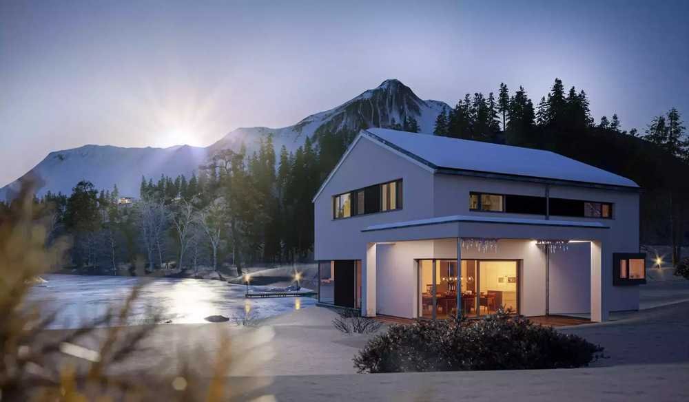 Dieses elegante Einfamilienhaus verbindet moderne Architektur mit einem zukunftsweisenden Wohnkonzept und jeder Menge Komfort für eine vierköpfige Familie. Das äußere Erscheinungsbild wird geprägt von einer klaren Linienführung. Im Zentrum steht ein schlichter, quaderförmiger Hauptbaukörper, der von einem flachen Satteldach gekrönt wird. Der bewusste Verzicht auf Dachüberstände verleiht dem Gebäude eine sehr elegante Note. Hinzu kommen attraktive Lichtöffnungen in verschiedenen Formaten: Schlanke, zurückgesetzte Fensterbänder, Übereck-Fenster und bodentiefe Verglasungen durchfluten das Innere mit Tageslicht und schaffen eine Verbindung zur umliegenden Natur. Ein Highlight ist die verklebte Eckverglasung auf der Gartenseite, die mit ihrer besonders filigranen Ansicht einen schönen Kontrapunkt zum hervorstehenden, grau gerahmten Übereck-Fenster auf der Eingangsseite bildet. Attraktive Erweiterungen findet das Fertighaus in der Pergola sowie im Carport, der sich in eine praktische Eingangsüberdachung verlängert. Sieht man genauer hin, erkennt man, dass das Satteldach wie auch die Pergola mit leistungsstarken Photovoltaikmodulen bestückt wurden, die sich dezent in die Architektur einfügen. Sie liefern nicht nur den Strom für die Haushaltsgeräte, sondern auch für das Elektroauto, das unter dem Carport betankt werden kann. Stromüberschüsse fließen in die Sonnenbatterie, wo sie für die Abend- und Nachtstunden bereitstehen. Die Energieströme des Plus-Energie-Hauses werden über ein intelligentes Gebäudemanagementsystem geregelt. So kommt der selbst produzierte Sonnenstrom immer dort an, wo er gerade gebraucht wird. Clever ist übrigens auch die Aufteilung des Grundrisses: Das Erdgeschoss ist fast vollständig den gemeinsamen Familienaktivitäten gewidmet. Nahtlos gehen die Bereiche Wohnen, Essen und Kochen ineinander über. Die Gemeinschaftsräume werden ergänzt von einem Bad mit Dusche und einem großen Büro mit Zugang zum ausgelagerten Technikraum. Später könnte hier vielleicht ein ebenerdiges Schlafzimmer entstehen. Die Privaträume liegen unter dem Dach. Sie bestehen aus zwei gleich großen Kinderzimmern, einem Kinderbad sowie dem Masterbedroom mit geräumiger Ankleide und offen angegliedertem Wellnessbad.