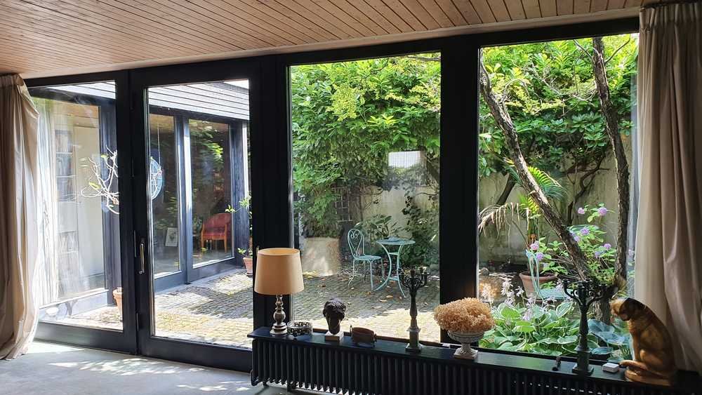 Das Haus wurde als Atrium-Haus mit großen Panorama-Fenstern errichtet, stammt aus 1970 und besticht durch die geradlinige Architektur, die Blickachsen in und durch das Atrium und die hochwertige Ausführung in den einzelnen Details. Die ebenerdige Ausführung macht es auch im Alter noch zu einem gut bewohnbaren Kleinod. Einen besonderen Hinweis verdient der attraktive Innenhof mit Springbrunnen, der über breite Terrassentüren sowohl vom Schlafzimmer aus, als auch vom Wohnzimmer und vom Esszimmer aus erschlossen ist. Das große Wohnzimmer mit offenem Kamin öffnet sich mit seinen großen Fenstern zu einem uneinsichtigen, romantischen Garten mit Schwimmbad und einer überdachten Pergola mit einem offenen Außenkamin.