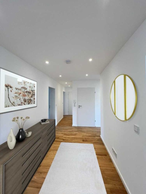 Nach dem Bad ebenfalls auf der linken Seite befindet sich die Küche, danach geht´s geradeaus ins Schlafzimmer. Gegenüber der Küche, auf der rechten Seite des Flures befindet sich der große Wohn-Essbereich. Vom Wohnzimmer aus gelangen Sie auf den 10qm-großen Balkon, der genau nach Westen ausgerichtet ist und auf dem sich perfekt die Abendsonne genießen lässt. Rechts vom Eingang befinden sich die beiden Kinderzimmer, die sich natürlich alternativ auch als Ankleidezimmer oder Homeoffice nutzen lassen. Die hervorragend geschnittene Wohnung eignet sich bestens für eine Familie mit ein oder zwei Kindern oder selbstverständlich auch für ein Pärchen, das einfach etwas großzügiger leben will.