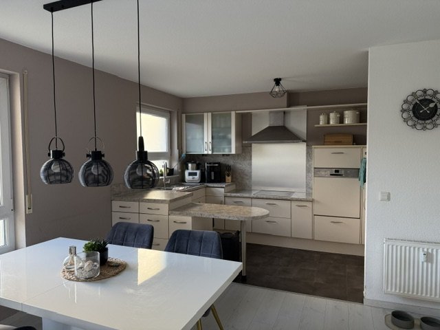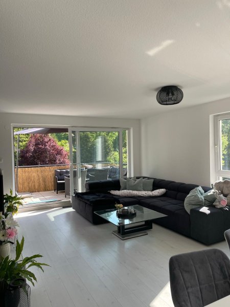 Über den Flur gelangen Sie in den großzügigen Wohn und Essbereich mit offener Küche. Vom Wohnzimmer geht es direkt auf den großen Balkon mit dem unverbaubaren Blick ins Grüne.