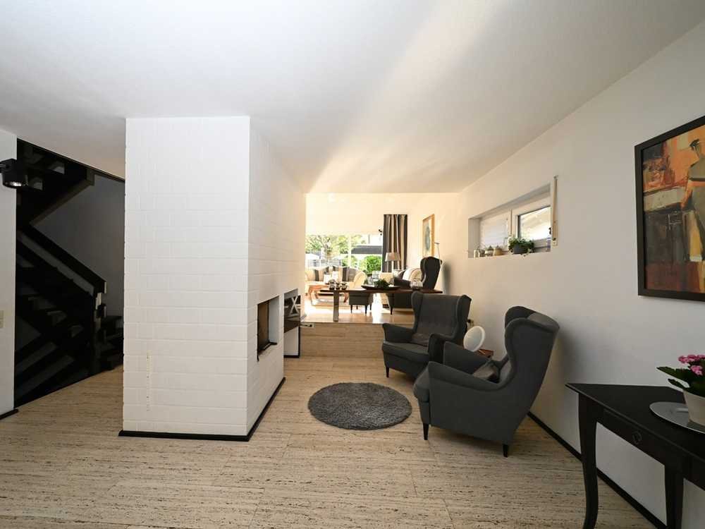 Das wahre „Raumwunder“ als Eckhaus eines Gebäude-Trios wurde im Jahr 1979 für einen damaligen Stahlwerksdirektor erschaffen, wobei ein besonderer Wert auf die geschmackvolle Materialwahl, das Design und die Qualität der Ausführung gelegt wurde. Mit diskretem Auftritt versprüht das außergewöhnliche Domizil jugendliche Leichtigkeit, die sich u. a. in der weißen Kalksandsteinfassade und der offenen Bauweise manifestiert. Mit einer üppigen Wohnfläche von ca. 195 qm ist Wohnraum in Hülle und Fülle vorhanden, der aufgrund der diskreten Erscheinung unerwartet überrascht und mit dem ca. 765 qm großen Grundstück den positiven Eindruck perfekt abrundet. Dank der von der Straße zurückversetzten Positionierung des Hauses und den vorgelagerten beiden Garagen, die das Zugangstor geradezu einrahmen, wurde ein gefälliger Innenhofcharakter geschaffen, der durch die mediterrane Bruchsteinmauer eine außergewöhnliche Ambiance schafft. Die hieran angrenzende Eingangsebene weiß mit einem großzügig ausgelegten Wohnbereich mit Kaminecke und Music Corner, mit Essbereich und angrenzender Küche insbesondere durch die edle Materialwahl und -komposition zu begeistern und offeriert über den Essbereich per Stahltreppe auch den Zugang zum rückwärtigen Gartenbereich. Über ein offenes, Ebenen verbindendes und stilformendes Treppenhaus gelangt man in den privaten Trakt im Dachgeschoss, der mit dem Master-Bedroom mit Badezimmer-en-Suite und einem Kinderzimmer mit Ostausrichtung begeistert und zur Westseite über zwei weitere Schlaf- oder Arbeitszimmer mit jeweils eigenem Loggia-Zugang und einem geräumigen Duschbad mit Wäscheschacht (zum im GG gelegenen Hauswirtschaftsraum) verfügt. Das Gartengeschoss beherbergt neben einem großflächigen Büroraum mit bodengleichen Schiebeelementen für den direkten Terrassenzutritt und den nachgelagerten Gartenbereich, einen Hauswirtschaftsraum sowie Vorratsraum und die Heiztechnik. In Summe, ein edel ausgestattetes Raumwunder hinter diskret-schöner Fassade mit attraktiver Gartengestaltung.