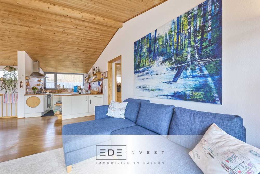 Holz-/Betondecke, ein zum First hin offener Dachraum, Holzfenster sowie Lehmputz an allen Außenwänden schaffen ein hervorragendes, ökologisch hochwertiges Raumklima.