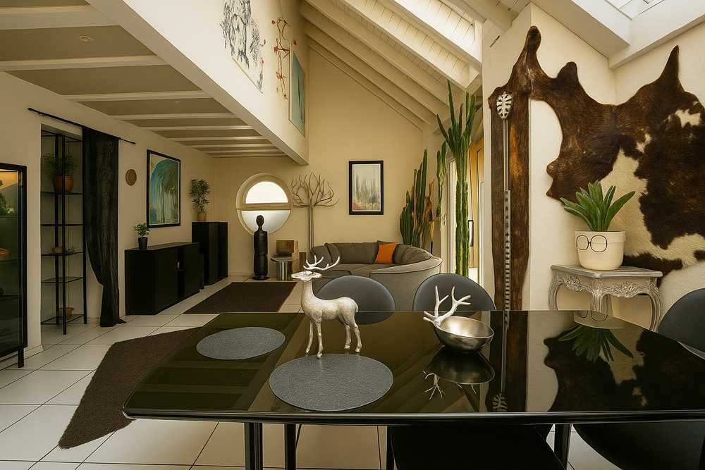 Das helle Wohn- und Esszimmer mit Balkon und Kaminofen-Anschluss sorgt für ein angenehmes Raumgefühl.