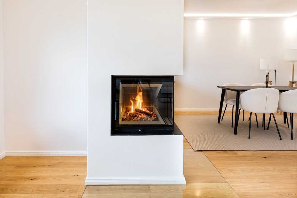 Der zentrale Wohn- und Essbereich bildet das Herzstück der Wohnung: Großzügige Fensterfronten schaffen eine lichtdurchflutete Wohlfühlzone mit freiem Blick über die Dächer Harlachings. Ein offener Kamin sorgt für behagliche Wärme, ideal für entspannte Abende.