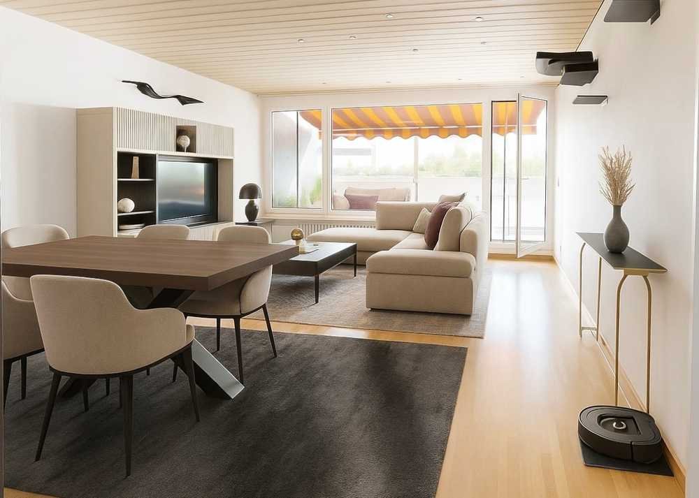 Das Herzstück der Wohnung ist das weitläufige Wohnzimmer mit seinen beeindruckend großen Fensterflächen, durch die das Tageslicht strömt und den Raum mit Wärme und Leben erfüllt. Von hier aus gelangen Sie direkt auf den außergewöhnlich großen Balkon – ein privater Logenplatz mit freiem Blick auf das Panorama der Alpen.
