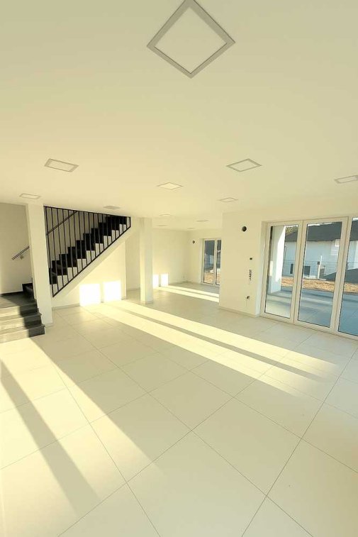 • Hochwertige Feinsteinzeug-Fliesen (80x80 cm) im gesamten Haus