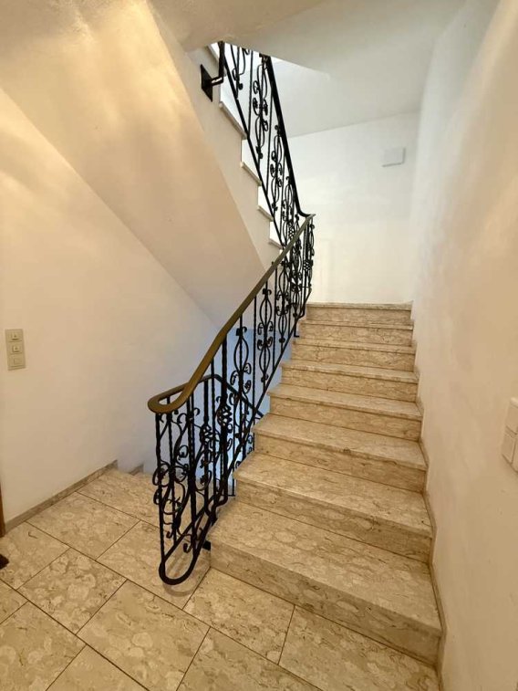 Die lichtdurchflutete Wohnung im 1. Obergeschoss verfügt über einen Balkon und ist ebenfalls mit Fußbodenheizung sowie einem stilvollen Kachelofen ausgestattet. Der helle Marmorboden im Treppenhaus sorgt für einen repräsentativen Eindruck. Diese Einheit ist seit 7 Jahren für 900 € kalt vermietet.