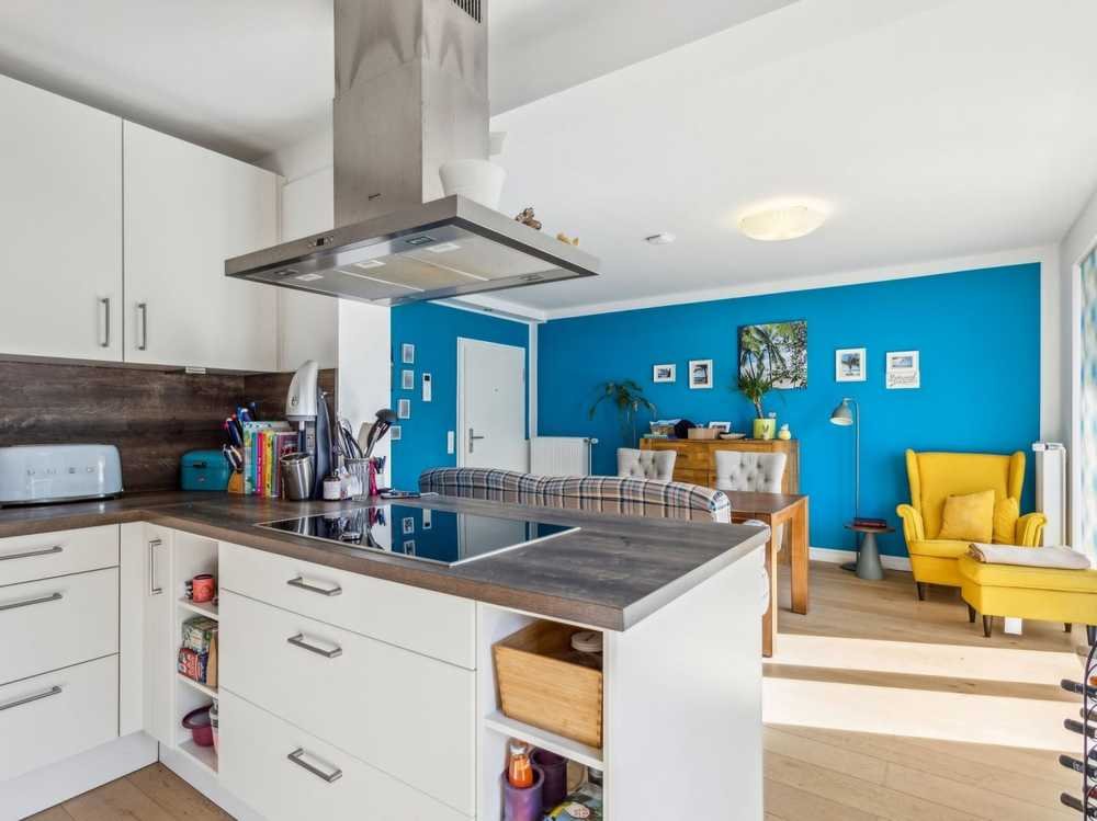Der großzügige, offen gestaltete Wohnbereich empfängt Sie mit einer harmonischen Verbindung aus Kochen und Essen. Die hochwertige Einbauküche ist mit modernen Geräten ausgestattet und lässt das Herz eines jeden Hobbykochs höherschlagen. Der angrenzende Essbereich besticht durch große Fensterflächen und den direkten Zugang zum Westbalkon, der über eine breite, elegante Außentreppe in den gepflegten Garten führt.