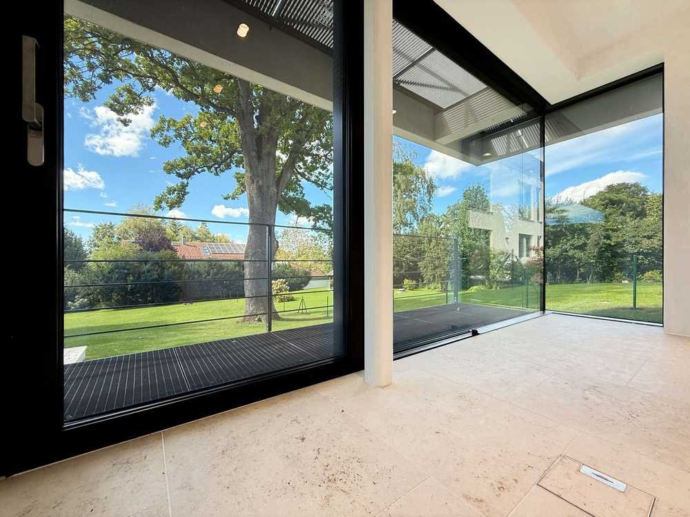 Im großzügigen Entrée eröffnet sich der stilvolle Wohn- und Essbereich mit raumhoher Panoramaverglasung, die nicht nur für ein beeindruckendes Raumgefühl sorgt, sondern auch den Blick auf den Wörthsee freigibt. Die maßgefertigte Einbauküche ist mit hochwertigen Markengeräten ausgestattet und fügt sich harmonisch in das moderne Wohnambiente ein.