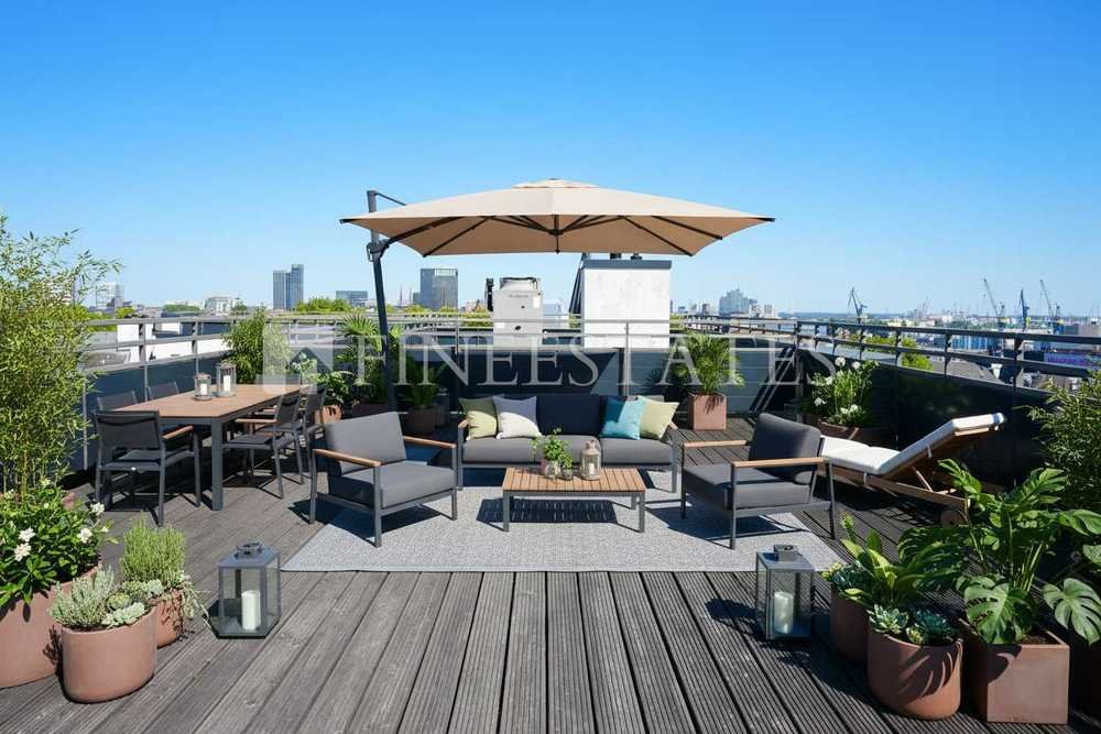Ein besonderes Highlight ist die rund 50 m² große Dachterrasse. Sie bietet viel Platz für verschiedene Aufenthaltsbereiche und lädt dazu ein, den Tag mit Blick über die Dächer der Stadt, den Hafen oder die Elbphilharmonie zu beginnen oder ausklingen zu lassen.