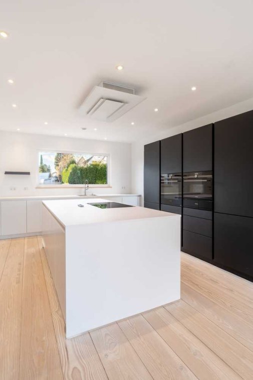 Im Erdgeschoss befinden sich neben der sehr modernen, hochwertigen Einbauküche eine Garderobe, ein Gäste-WC sowie der großzügige Wohn- und Essbereich. Von hier aus gelangen Sie direkt auf die weitläufige Terrasse und in den gepflegten Garten. Der gesamte Wohnbereich ist mit einem edlen Echtholzparkett aus dem Schwarzwald ausgestattet, das dem Haus eine warme und schöne Atmosphäre verleiht.