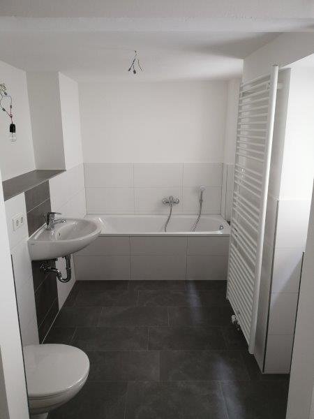 Fliesen in beiden Bädern, Eichenparkett in Wohn- Arbeits- und Kinderzimmer, Vinyl-Designboden in Schlafzimmer und Flur