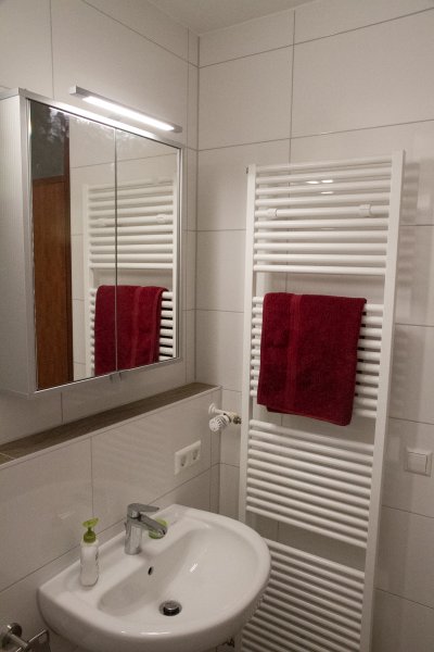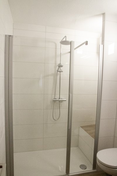 Das neue innenliegende, deckenhoch hell geflieste Badezimmer bietet Dusche, Waschbecken mit Spiegelschrank und WC.