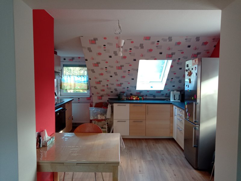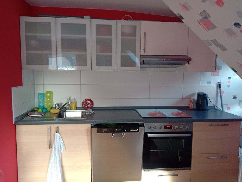 Die Wohnung hat ein großes Wohnzimmer mit offener Küche. Die Einbauküche sollte übernommen werden.