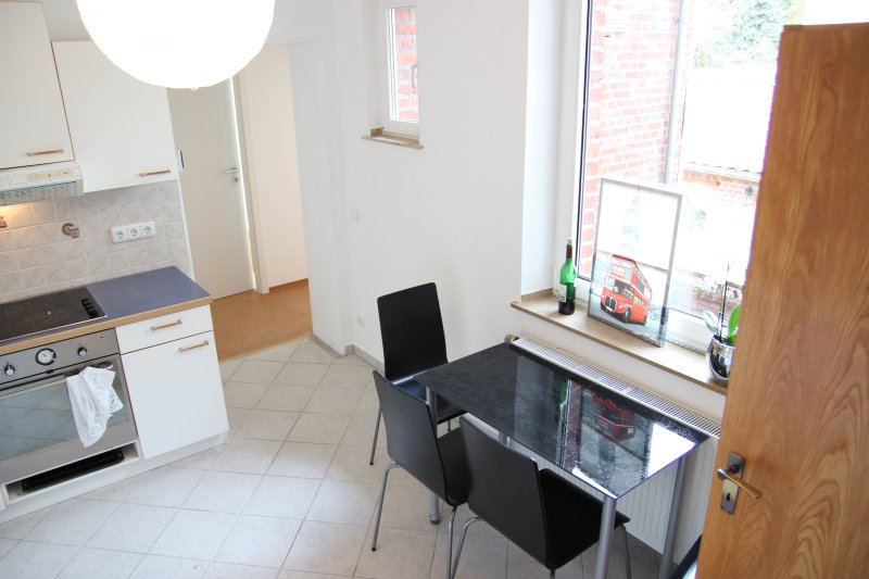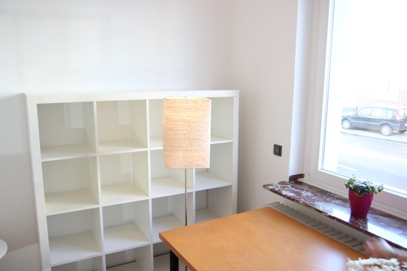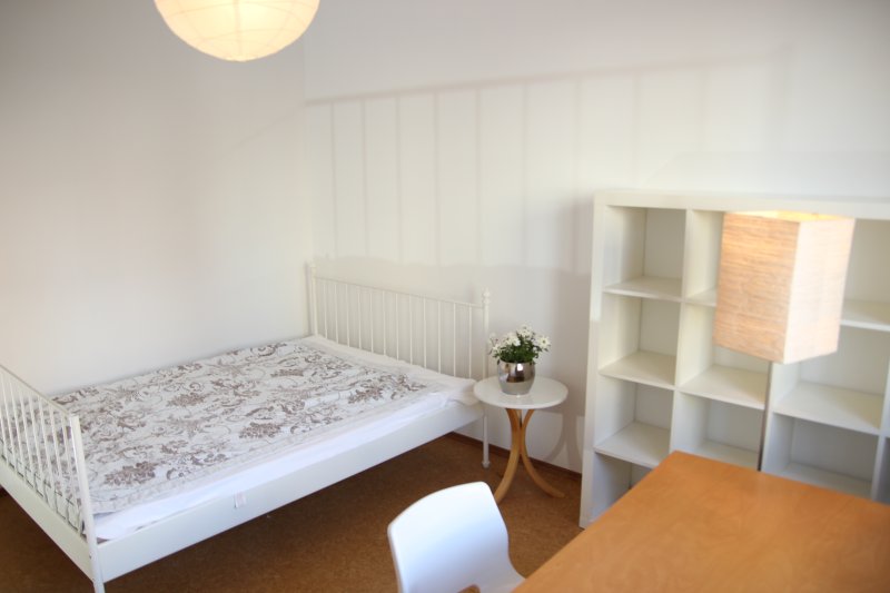 hohe weiße Decken, helle Wände, Laminat und große Fenster machen die Räume freundlich und hell. Das Zimmer wurde frisch renoviert und wird voll möbliert mit Lampen, Schreibtisch, Kleiderschrank und Bett übergeben. Das Zimmer hat ein gemütliches breites Bett.