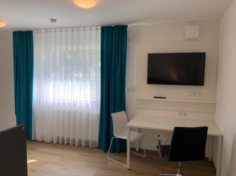 Außerdem steht Ihnen ein Essplatz, ein Schreibtisch, ein Einzelbett mit Nachttisch und ein großzügiges TV-Gerät zur Verfügung