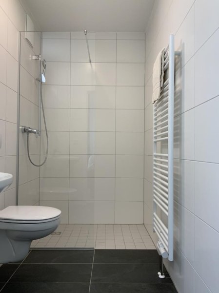 Das Badezimmer ist mit einer barrierefreien Dusche und einer Heizung zum Trocknen der Handtücher ausgestattet.