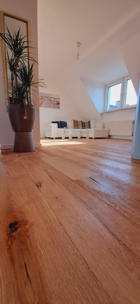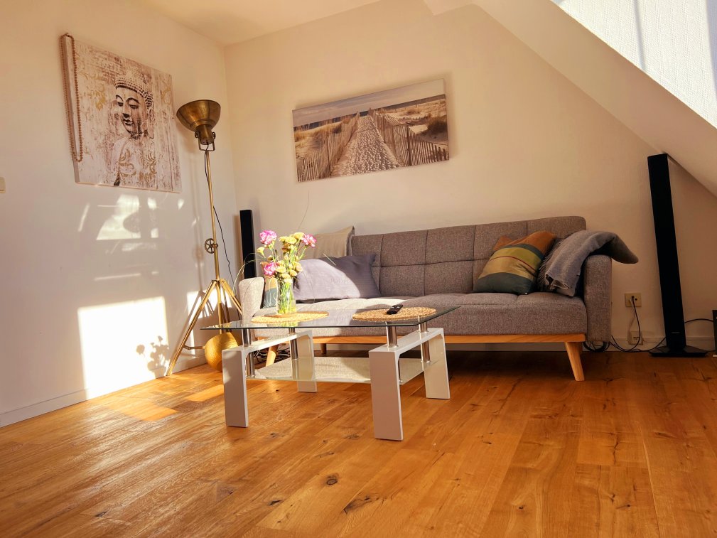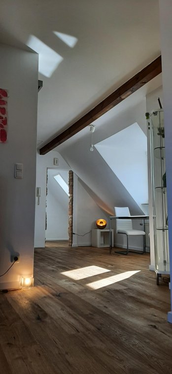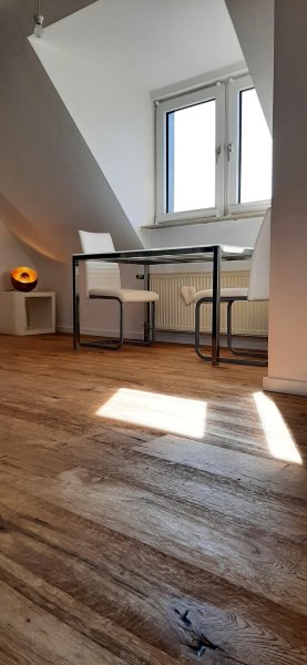 Die 2,5 Zimmer Wohnung mit 56 qm² wirkt größer –aufgrund der Dachschrägen (nicht bis zum Boden gehend) u. der Fenstergauben. Perfekte Raumaufteilung, offenes Design, Lichteinstrahlung von zwei Himmelsrichtungen erzeugen e. weite Perspektive. Möbel in hellem, zeitgenössischem, eleganten Design sind zusätzlich mit Stereoanlage u. WiFi ausgestattet für das perfekte Arbeiten und Leben.
