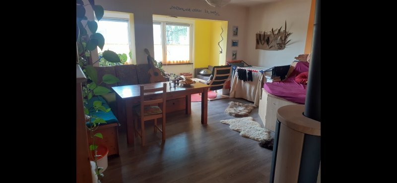 Die Wohnung hat ein grosses Wohnzimmer mit Kamin und einen kleinen Garten mit Feuerstelle und Hochbeeten zur gemeinsamen Nutzung sowie einen Abstellraum.