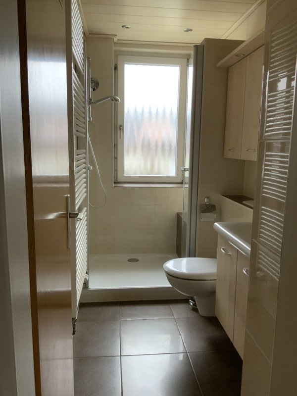 Küche mit Speisekammer, Flur und Tageslicht Badezimmer mit Dusche im 1 OG eines 3-Familienhauses.