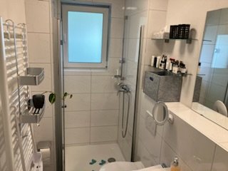Die Wohnung ist mit einem hochwertigen, warmen Vinylfußboden belegt und das schmale Tageslichtbad (5,5qm) ist mit modernen Platten, Wandheizung und Dusche ausgestattet. Von der großzügigen und lichtdurchfluteten Eingangsdiele (7qm) mit Garderobe, Schuhschrank und Spiegel gelangen Sie in das gemütliche Wohnzimmer (20qm) mit tiefen Fenstern und dem angrenzenden Essbereich mit ausziehbarem Esstisch (Ligne Roset). Die offene Küche (15qm) (Leicht- Einbauküche) ist vollständig ausgestattet und verfügt über eine Theke und eine offene Abstellkammer mit Waschmaschine und Putzzubehör. Man gelangt zum großen Ost-Süd Balkon (11qm) mit Sitzmöglichkeiten und Holztisch über zwei separate Balkoneingänge. Das Schlafzimmer (13qm) (Gartenseite) ist mit einem 1,80m Bett, 2 Nachttischchen und Wandschrank eingerichtet. Das Arbeits- bzw. Gästezimmer (19qm) (Straßenseite) verfügt über ein aufklappbares Bettsofa, einem hochwertigen Schiebetürenschrank, Kommode und Regal. Die Wohnung besticht insbesondere durch die gelungene direkte und indirekte Beleuchtung und das freundliche Mobiliar mit Liebe zum Detail.