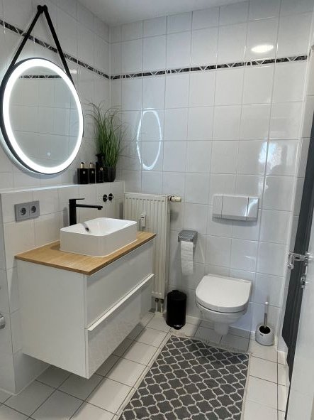 In alle Zimmern sind weiße Heizkörper in einem neuwertigen Zustand. Das Bad und die Küche ist weiß gefliest. Im Bad befindet sich eine Badewanne, eine Toilette, sowie ein Waschbecken mit Schubladen und Armaturen und einen Waschtrockner.