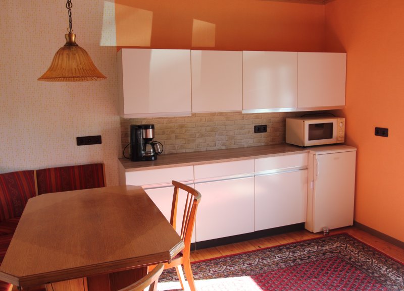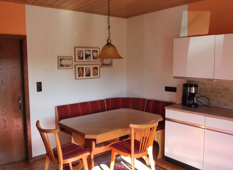 Im Erdgeschoss befindet sich die große Wohnküche mit Eckbank 2 Stühlen und Esstisch, sie hat Herd mit Backofen, Spüle, Kühlschrank, Geschirr, Kaffeemaschine, Mikrowelle und alles was man braucht.