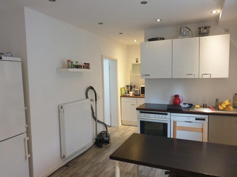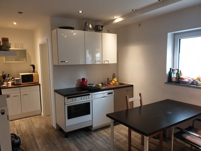 In der WG befindet sich eine gemütliche Wohnküche. Diese ist mit Herd, Kühlschrank und Geschirrspüler ausgestattet. Das Tageslichtbad ist sehr modern mit großen Hochglanzfliesen in schwarz-weiß gefliest. Ein Waschmaschinen- und Trockneranschluss ist im Bad vorhanden. Die Geräte müssen aber mitgebracht oder angeschafft werden. Ebenso wie das Geschirr für die WG-Küche.