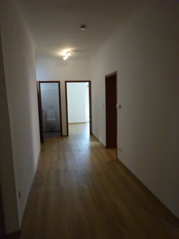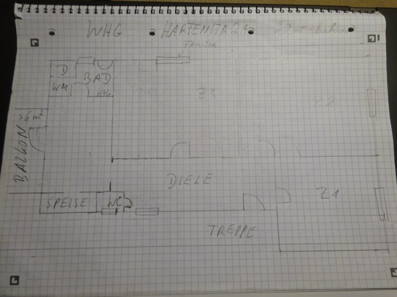 Alle 3 Zimmer sind 17 bis 18 qm gross und von einer grossen Diele (zusammen mit Küche und Balkon auch als Gemeinschaftsraum nutzbar) aus zugänglich. Funktionsräume wie Toilette, Bad und Küche zusammen in anderem Teil der Wohnung.