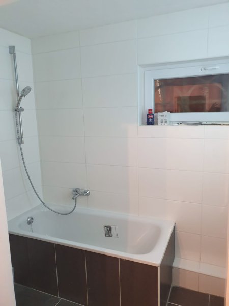 Das Badezimmer mit Fenster wurde neu saniert, es ist Deckenhoch gefliest und verfügt über eine neue Badewanne, ein neuer