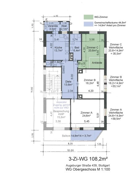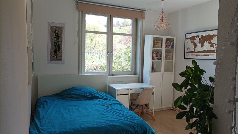 Die WG, in der ich mit zwei Mitbewohner innen Moritz und Svenja wohne, befindet sich im Obergeschoss einer Jugendstil-Villa, direkt an den Weinbergen und oberhalb der Weinberge befindet sich das Naturschutzgebiet Kappelberg und Rotenberg mit einem wunderschönen Wald zur Erholung. Das Zimmer hat einen kleinen Wintergarten, der zu den Weinbergen rauszeigt (in Wohnfläche einkalkuliert). Im Zimmer ist außerdem ein großer, begehbarer Kleiderschrank fest eingebaut, der viel Stauraum bietet.