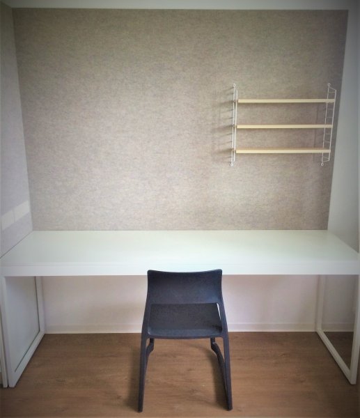 - Arbeitsplatz mit Schreibtisch und Pinwand