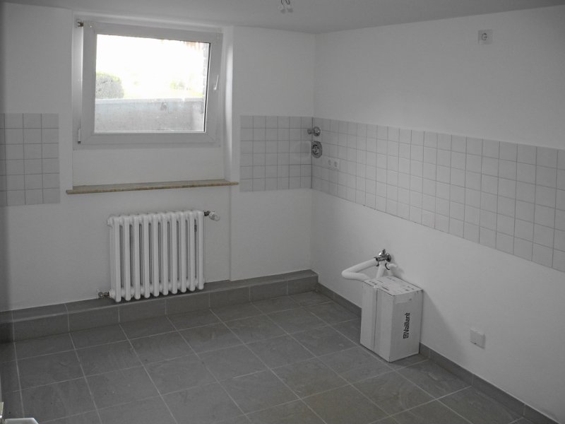 Küche mit Steinzeugboden, getrennten Strom- und Wasser-Anschlüssen für Spülmaschine, Waschmaschine, Trockner, etc.