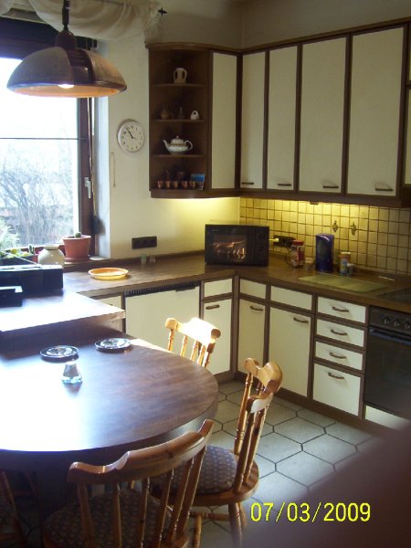 Mit schöner, moderner, großer Einbauküche und einem großen,runden Esstisch mit 5 Stühlen für Besuch, einer SPÜLMASCHINE sowie eine MIKROWELLE, einem Ceran-Kochfeld-Herd mit großem Backofen und einem extra Backofen für kleine Mahlzeiten auf der Küchenarbeitsplatte.