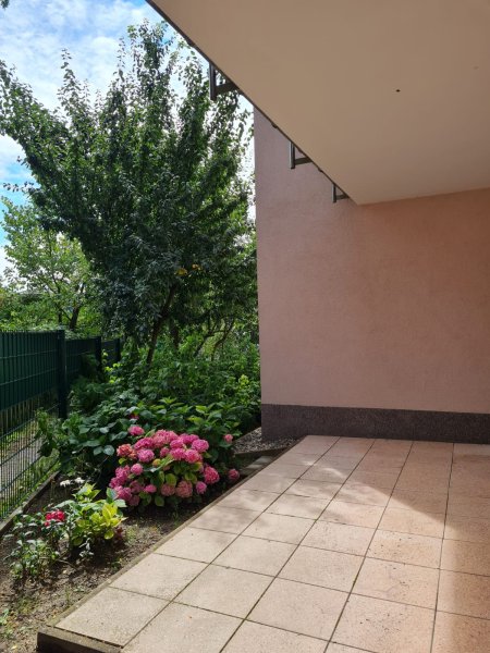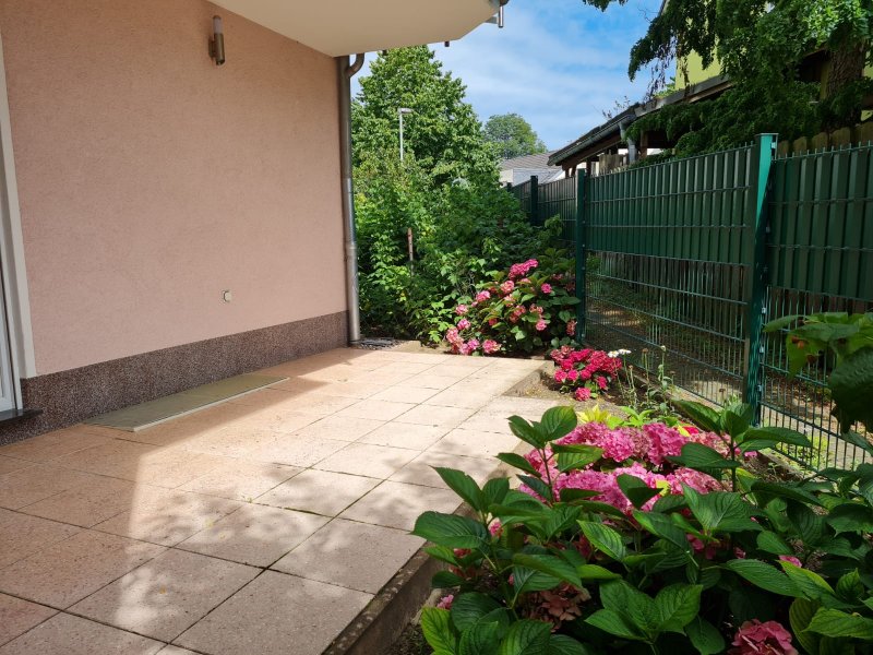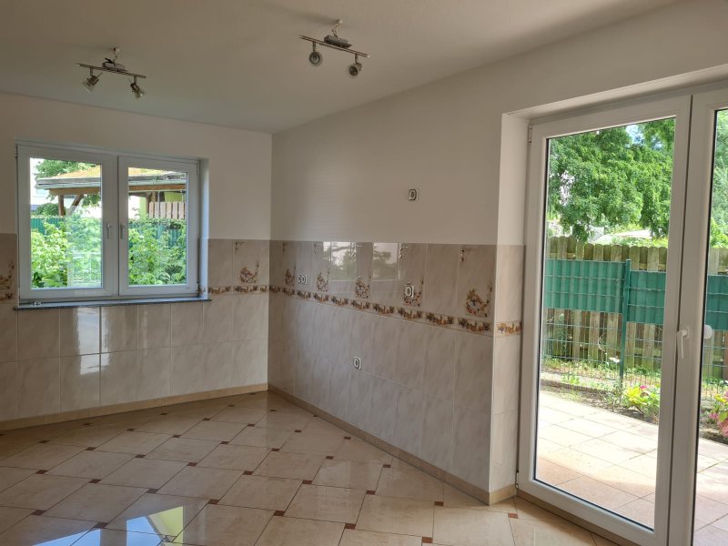 Seitlich von der geräumigen Küche, die auch viel Platz für einen großen Ess- oder Arbeitstisch bietet, betreten Sie die sonnige Frühstücksterrasse im Grünen.