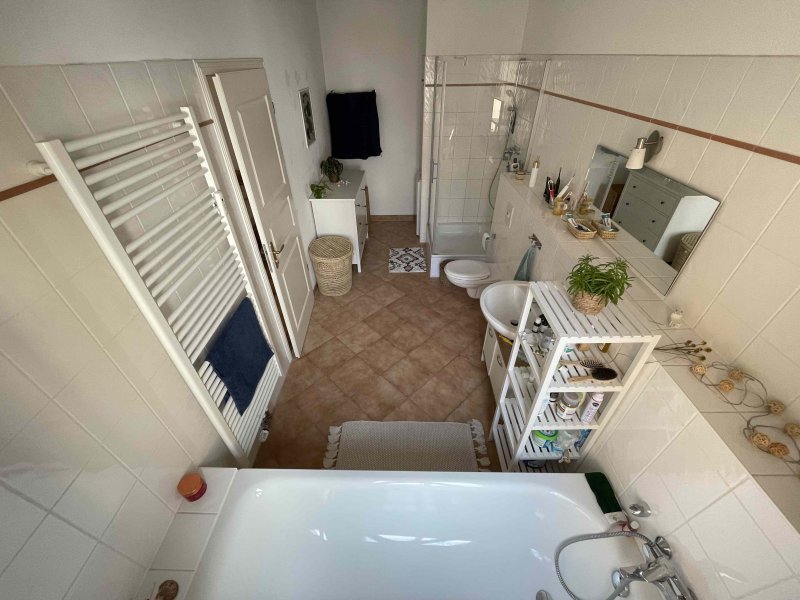 Die Wohnung ist 110m² groß und besteht aus Wohnzimmer (ca. 30 m²), Küche mit großem Essbereich, einem Durchgangszimmer, das wir als Ankleidezimmer verwenden, Schlafzimmer, Badezimmer (inkl. Dusche und Badewanne), WC, einer Kammer und zwei Balkonen. Sie befindet sich im Hinterhaus eines 2002-3 sanierten Altbaus, ein gemeinsamer Hof mit Fahrradständern und Sandkasten sowie ein Keller sind vorhanden.