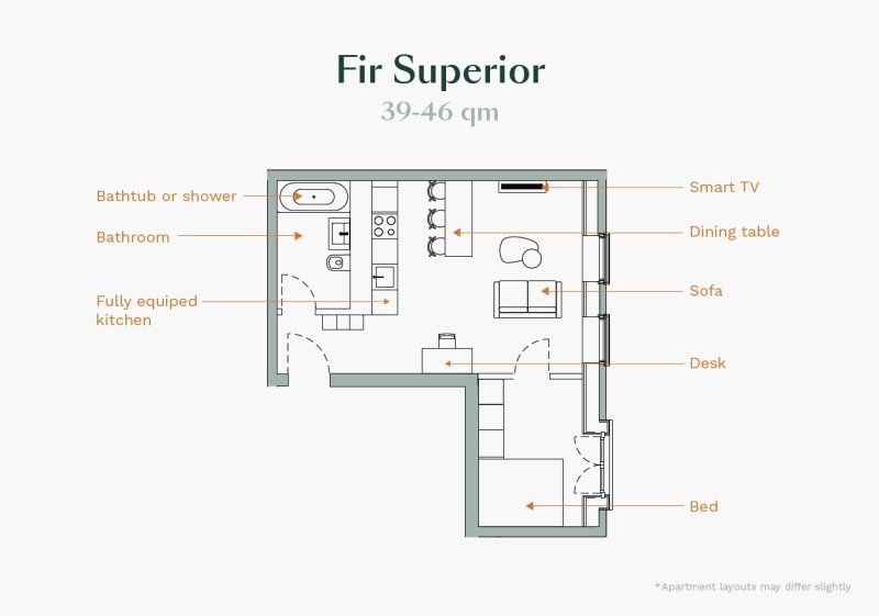 Zentral und doch tiefenentspannt. Auf 40-46 Quadratmetern erleben Sie unser Fir Superior Apartment jenseits des turbulenten Stadtlebens. Mit separatem Wohn- und Schlafbereich schaffen Sie eine klare Trennung zwischen nächtlicher Ruhe und täglichem Wohnen innerhalb Ihrer eigenen 4 Wände. In einer Zeit wo wohnen und arbeiten mehr und mehr ineinandergreifen, ist unser Fir Superior Apartment die perfekte Basis für Ihr Home Office. Unsere Fir Apartments verfügen allesamt über einen liebevoll gestalteten Wohn- und Essbereich mit offener Küche. Perfektionieren Sie Ihr Wohnerlebnis und wählen Sie Ihre neues zu Hause mit einem eigenen Balkon.