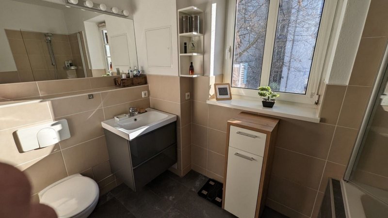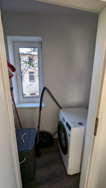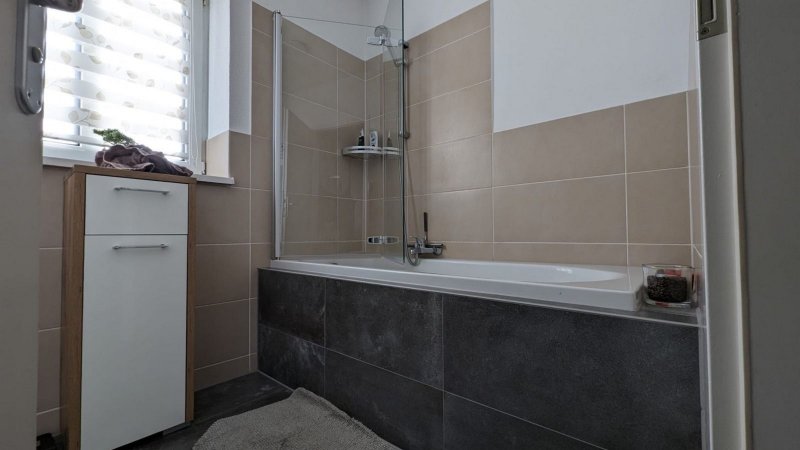 Waschmaschine, Bad mit Badewanne, Laminatboden, Fliesen.