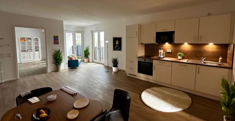 In diesem Beispiel zeigen wir Ihnen eine 2-Raum-Wohnung mit Einbauküche und Balkon. Das Bad mit der großen Dusche ist barrierefrei. Die Wohnung hat 64,99 Quadratmeter, es gibt aber auch größere und kleinere Wohnungen.