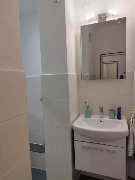 Das hell geflieste Badezimmer verfügt über eine Dusche, Waschbecken mit Spiegel und Unterschrank, sowie über eine Toilette.