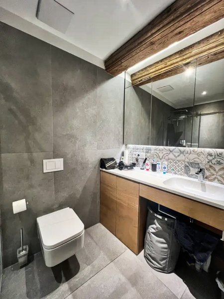 Das Badezimmer, modern und sauber mit einer geräumigen Dusche und klaren Linien, gibt Ihnen einen frischen Start in den Tag.