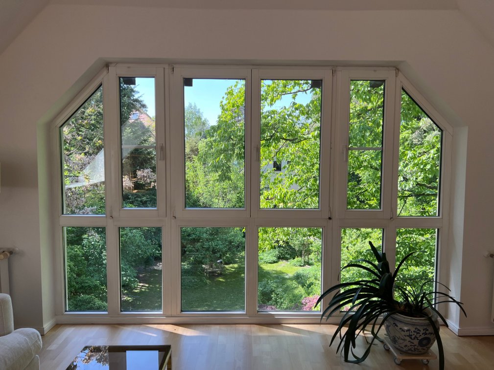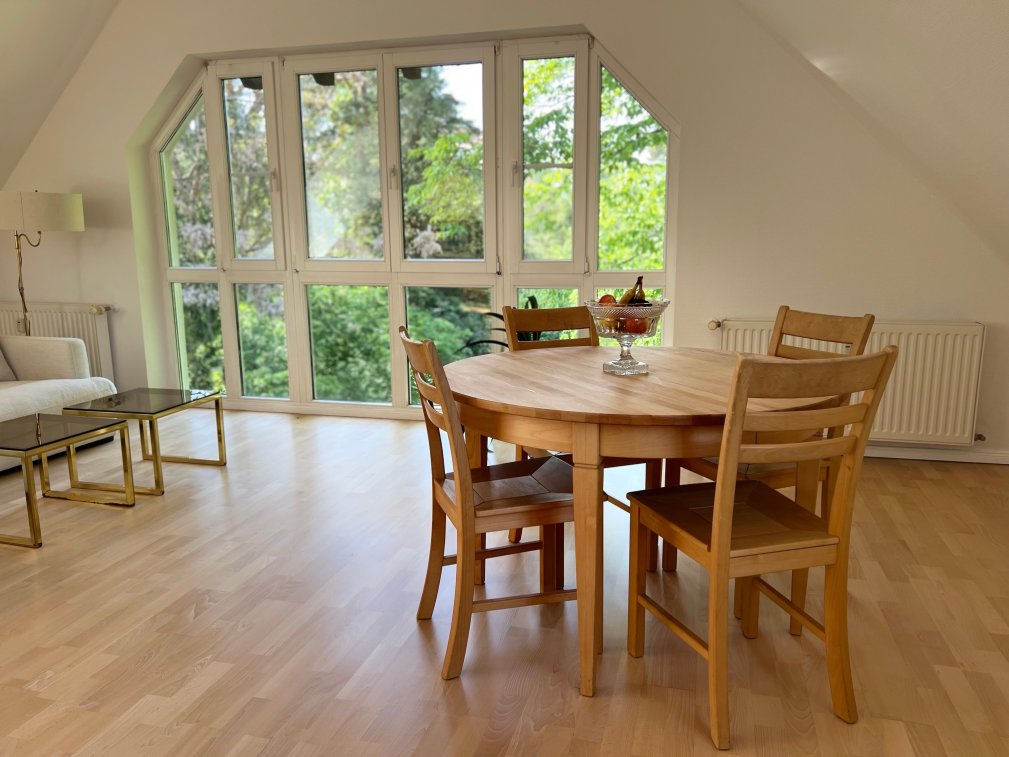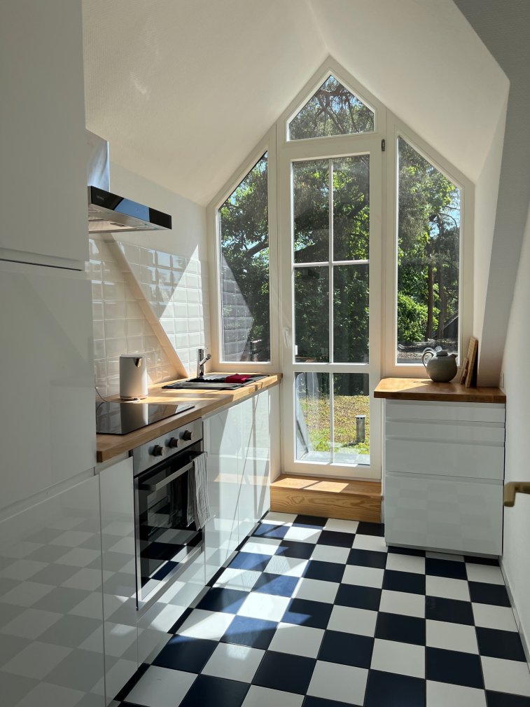 Die neue Einbauküche nutzt auch den kleinen Raum mit Giebel perfekt aus. Ausgestattet ist die Küche mit modernen Geräten und einem eleganten Design. Eine Tür führt vom Küchenbereich auf einen einladenden Dachbereich, der zusätzlichen Raum für Entspannung und Unterhaltung bietet.